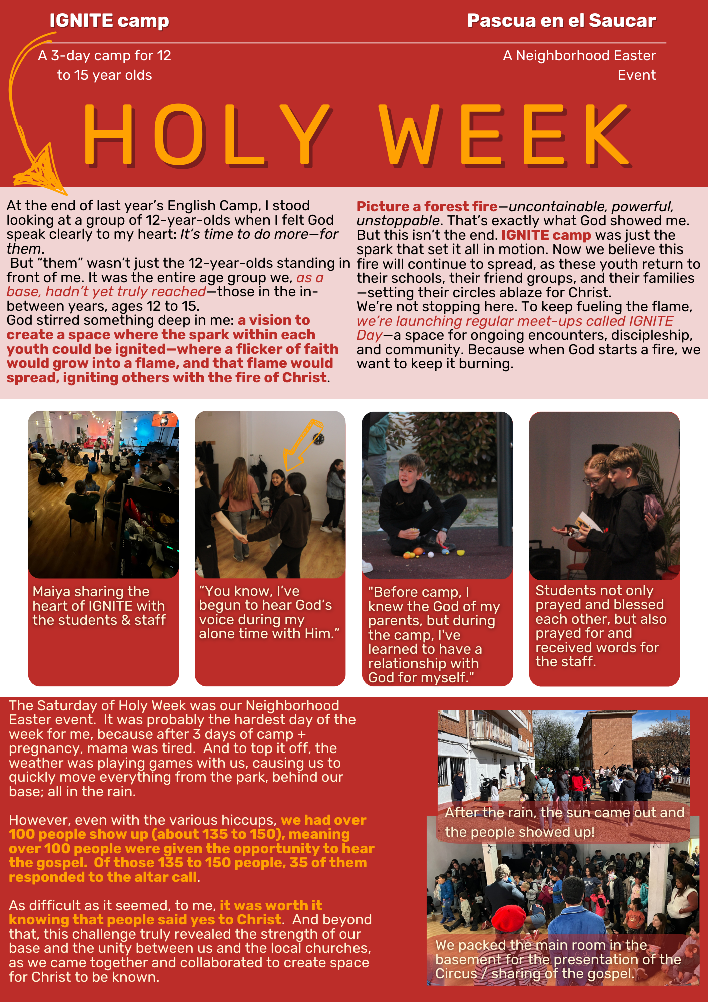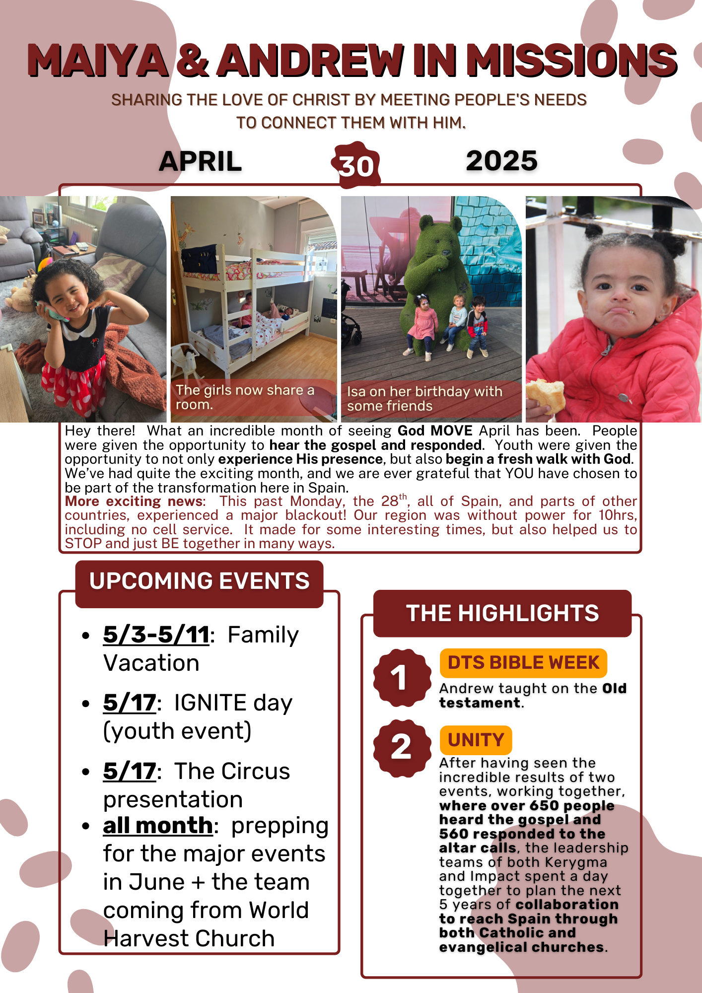 Blessings! Andrew, Maiya, Isabela & Gabriela Kuettner Partner With Us fire burning flicker Holy Week ignite meetnostrangers missionary Spain YWAM ywammadrid Previous post Read previous post Feb/Mar 2025: Life is good. God is GREAT. Next post Read next post May 2025: Fire is Spreading Related postsSumma Summa Summa Time 2025May 2025: Fire is SpreadingDecember 2024: A Very Merry Christmas Comments are closed.